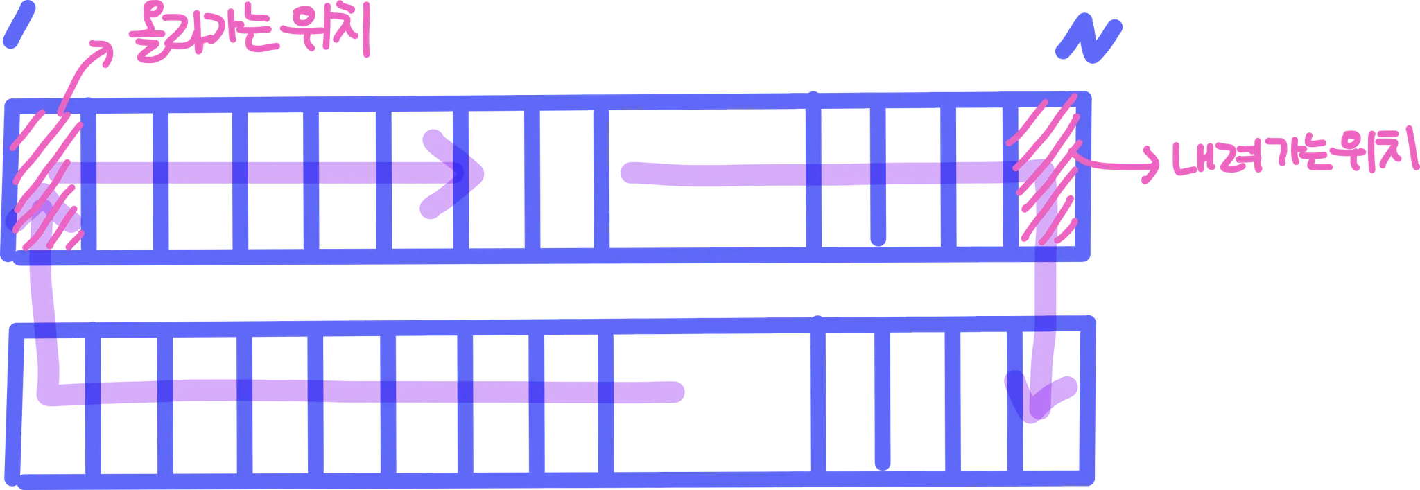 올라가는 위치(up_idx) 와 내려가는 위치(down_idx)를 인덱스로 가지고 있어 그 수를 변경해주는 과정으로 대신했다