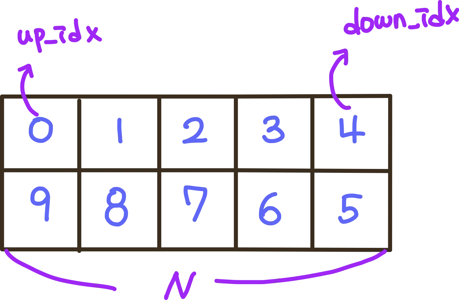 단순히 down_idx~ up_idx 까지 반복문을 돌리게 되면 중간에 2→1→0→2N→2N-1 과 같은 순서에서는 오류가 발생하게 된다.