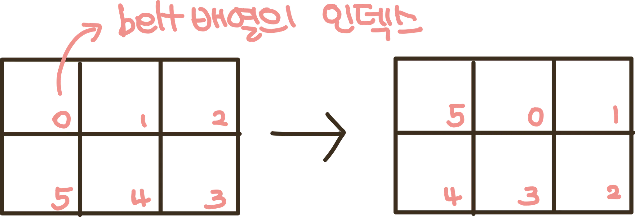 벨트가 오른쪽으로 한칸씩 움직이게 되면 아래의 그림과 같이 각 자리의 인덱스가 -1씩 줄어들게 된다.