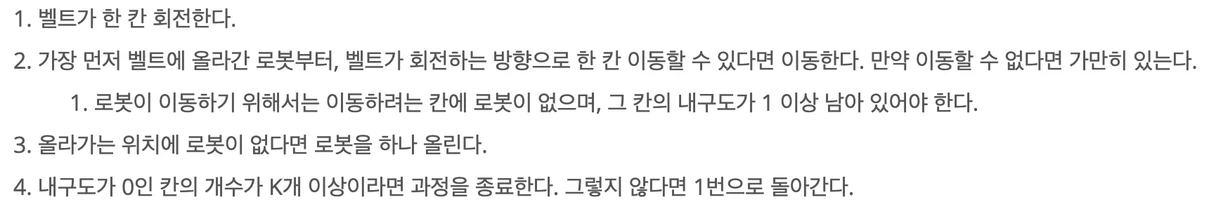 4. 내구도가 0인 칸의 개수가 K개 이상이라면 과정을 종료한다. 그렇지 않다면 1번으로 돌아간다.