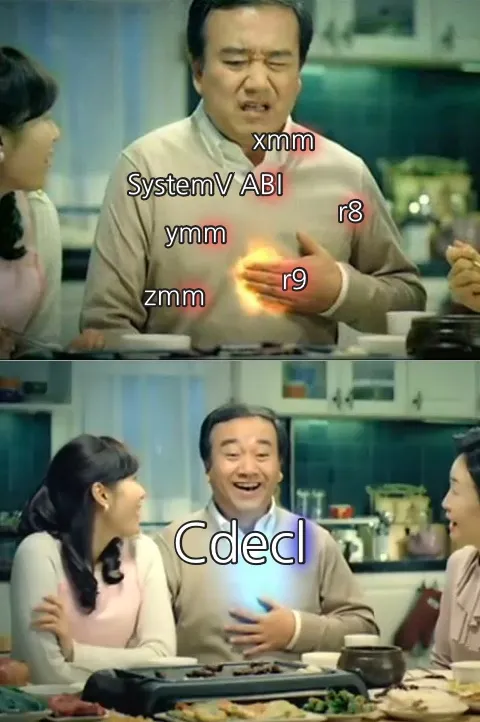 왜냐면 sysv 호출 규약은 레지스터랑 스택 섞어써서 보기 어렵거든요