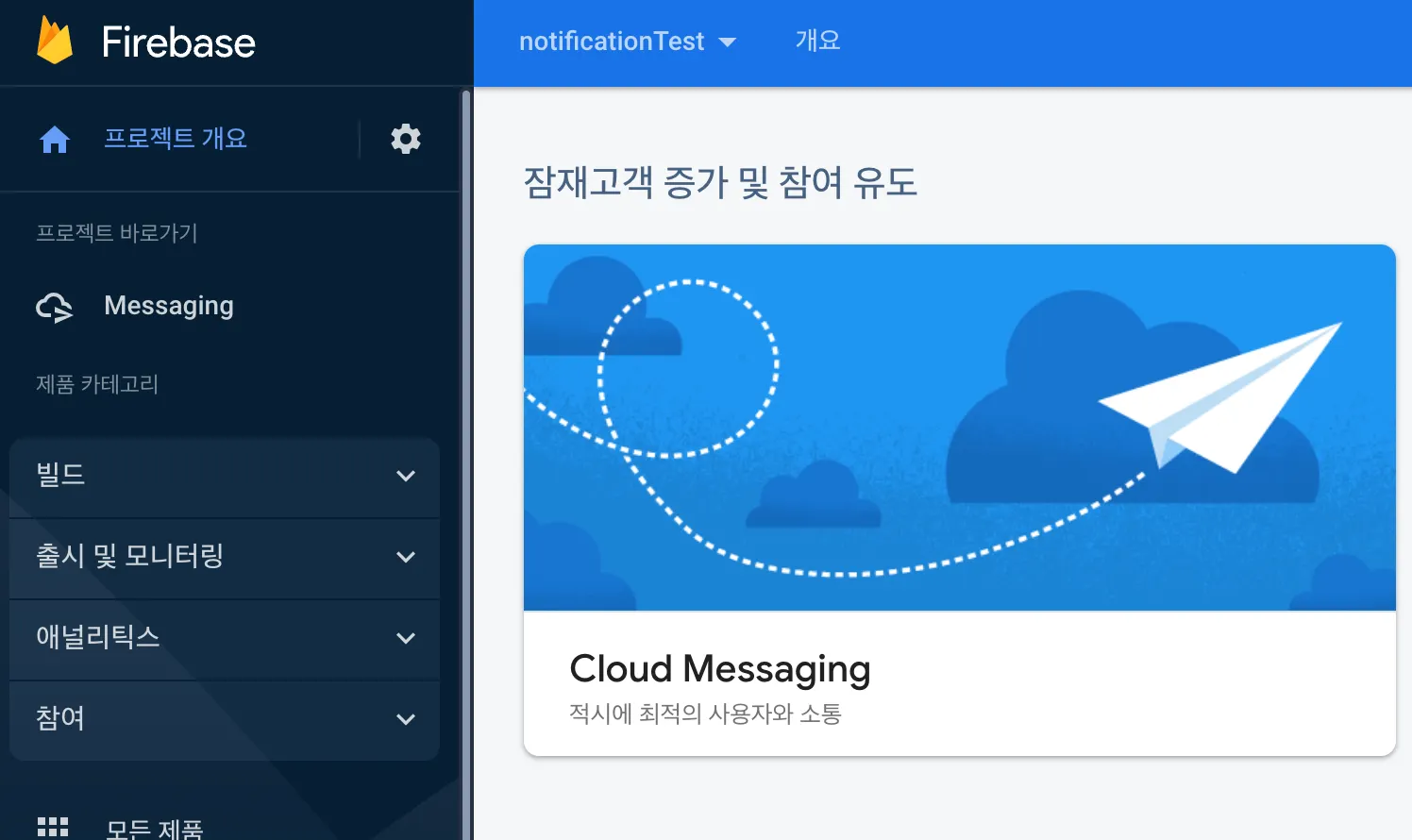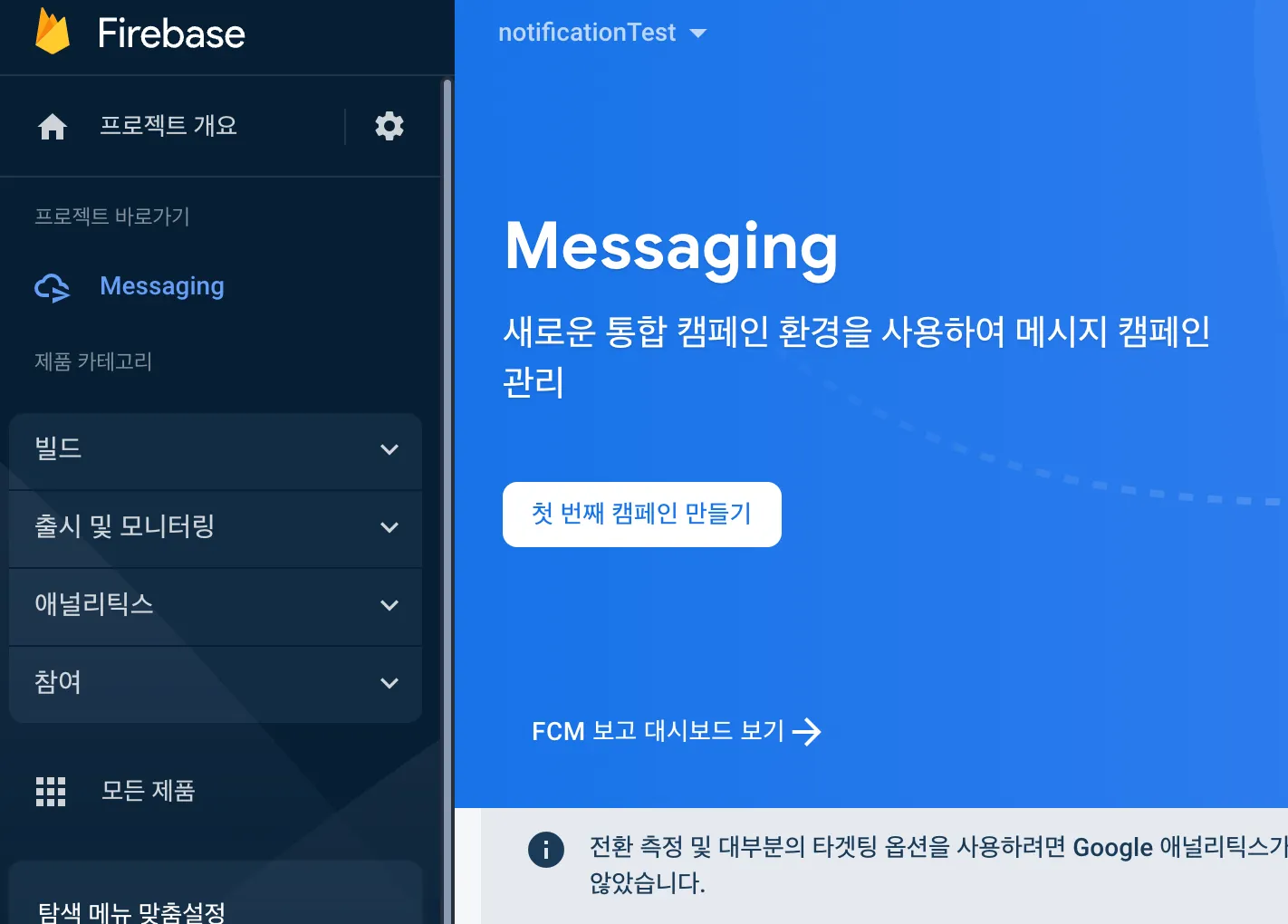 FCM(웹페이지)에서 본인이 원하는 방식의 구성(Android, iOS, Web)을 선택하고, 앱 이름을 설정하면 프로젝트가 생성된다.