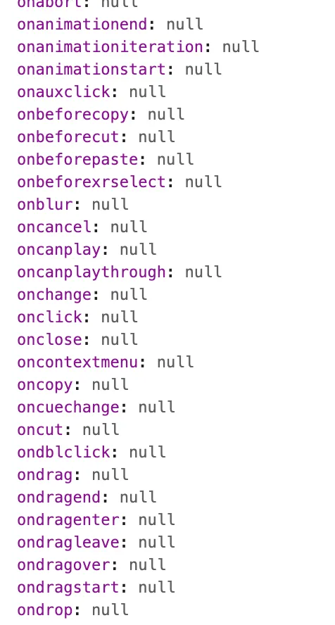 →콘솔에 표시되는 요소들 중 on~ 으로 시작되는 요소들이 Events