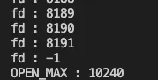 OPEN_MAX 값을 확인하고 싶다면, 터미널에서 getconf OPEN_MAX라고 쳐보면 그 값을 얻을 수 있다. 혹은 터미널에서 sysconf(_SC_OPEN_MAX)를 통해서도 알 수 있다.