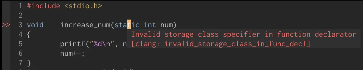 매개 변수에 static을 붙이더라도 매개 변수는 static으로써의 역할을 수행할 수 없다. 즉, 값이 유지 되지 않는다. 아래와 같이 매개 변수로 사용하려고 하면 오류가 나는 것을 볼 수 있다.