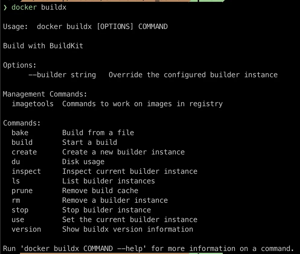 아래와 같이 buildx에 대한 설명이 나오면 정상적으로 활성화가 된 것이다.