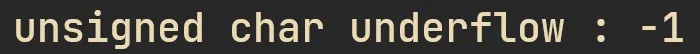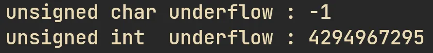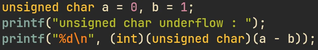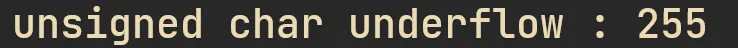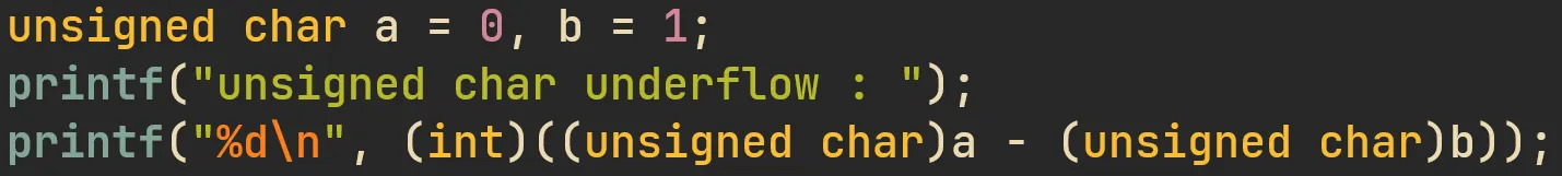 아래의 결과처럼 우리의 예상과는 달리 unsigned char의 연산은 underflow가 발생하지 않고 마치 미리 int형으로 type casting을 한 것 마냥 연산결과가 나온 것을 알 수 있습니다.