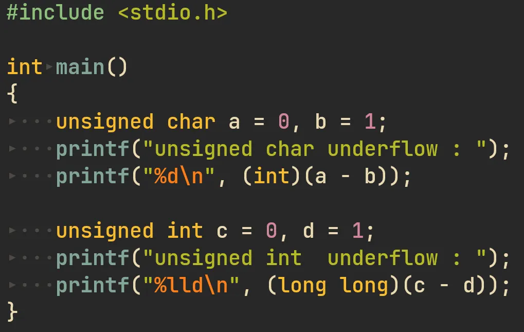 libft과제를 진행 중 신기한 현상을 보았는데요. C에서 산술연산을 할 경우 type의 범위를 넘어가면 overflow나 underflow가 발생합니다. 즉 아래와 같은 코드에서는 모두 underflow가 발생할거라고 예상할 수 있습니다. 두 연산의 결과 모두 해당 타입의 MAX값을 출력하게 되겠죠. 그런데 과연 그럴까요?