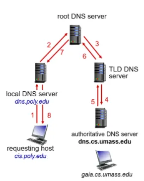 3) 로컬 DNS는 다시 최상위 DNS 서버에게 질의함 알고 있냐고. → 책임 DNS 서버는 알고 있을 꺼라고 알려준다
