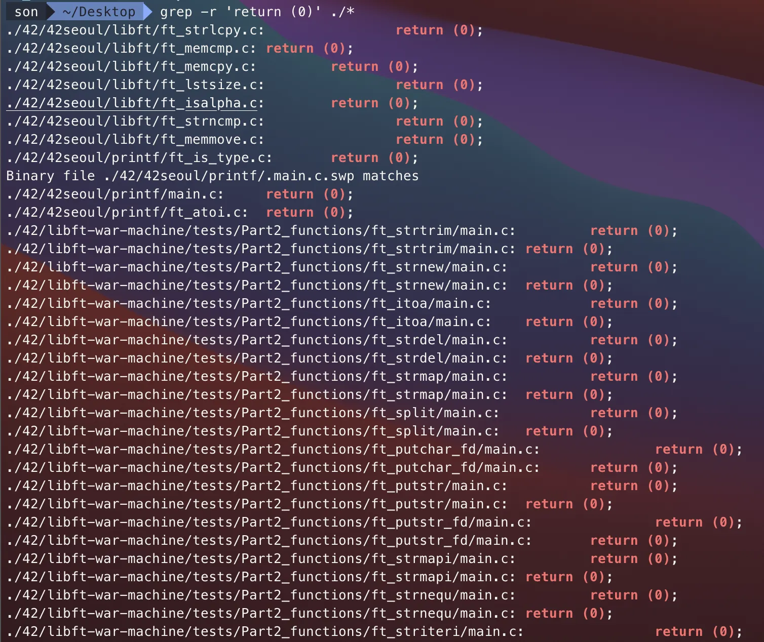 모든 경로에서 return (0)가 포함된 파일들을 찾아 출력해주는 모습을 확인할 수 있다