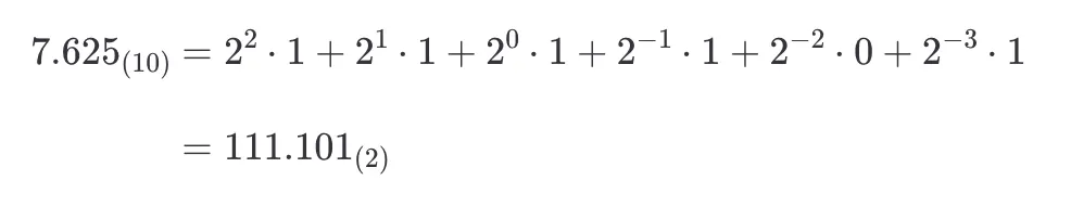 예를 들어, 10진수 7.625를 32비트 고정 소수점으로 표현해보겠습니다. 먼저 10진수 7.625를 2진수로 표현하면 다음과 같습니다.