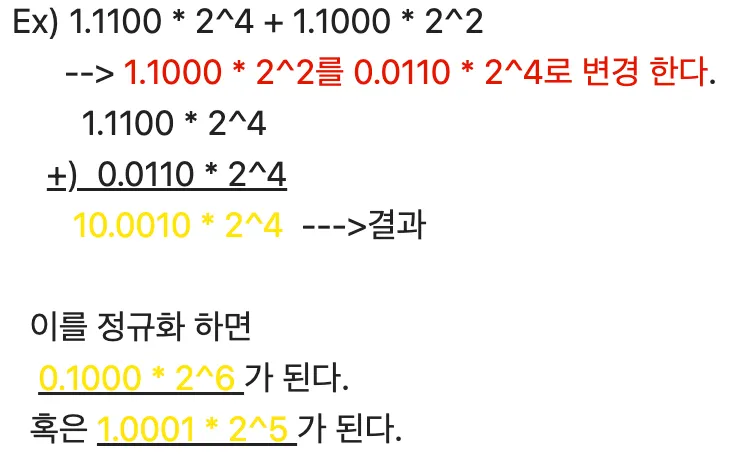 예를 들어 0.000101 라는 2진수를 정규화하면 1.01 * 2^-4 라는 값을 얻게 됩니다.