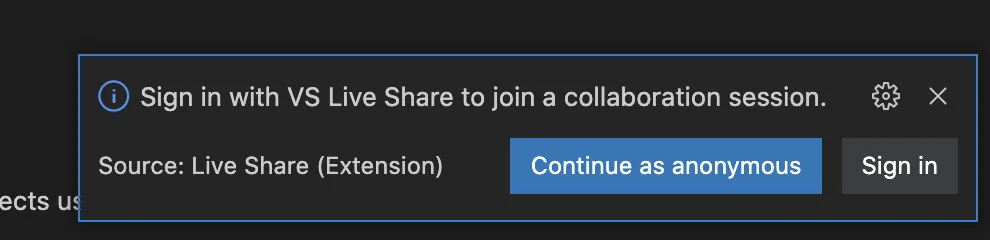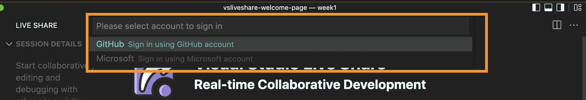2번에서 생성된 Live Share 아이콘을 선택하고, Share 버튼을 클릭하면 아래와 같은 이미지가 VSCode 상단에 표시된다. Github 또는 Microsoft 계정을 선택해서 로그인한다.