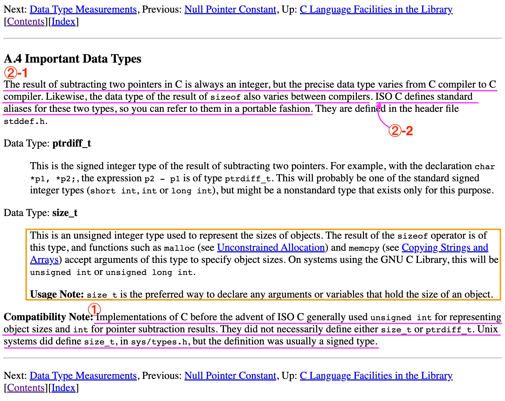당시 사람들은 size_t 나 ptrdiff_t 를 정의할 필요성을 느끼지 못했다. (UNIX 시스템에서 size_t를 정의하기는 했었지만 부호가 있는 자료형이었다.)