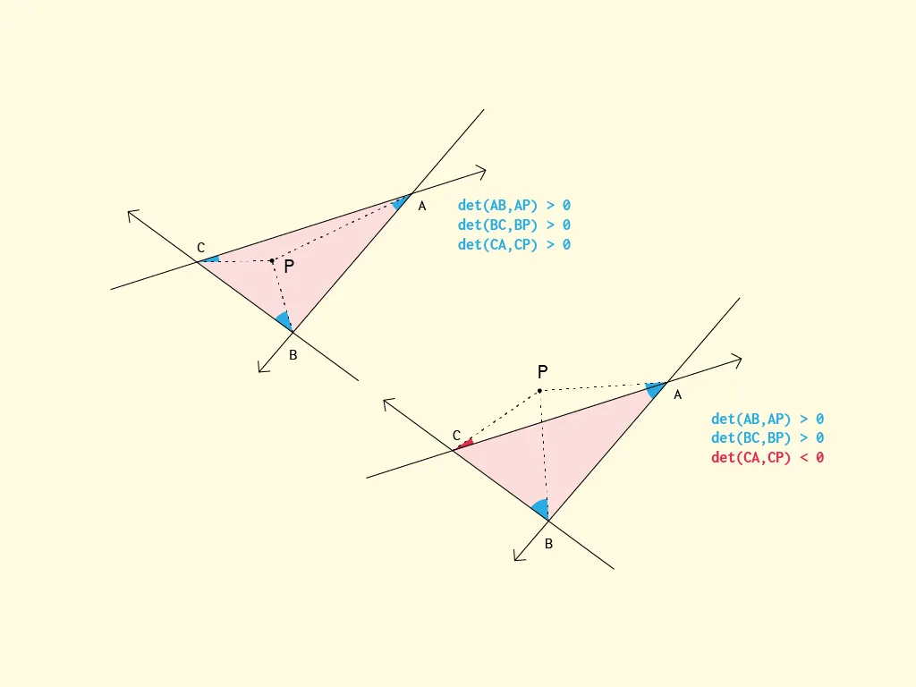 피드백에 의하면, sign() 함수가 면적을 구하는 것은 맞는데, 값에 나누기 2를 한 다음 절대값을 붙여줘야 제대로 된 넓이가 나온다. 아니라면 P가 어디에 있든 세 면적의 합이 같다. (잘못된 부분 알려주신 카뎃님 감사합니다!)