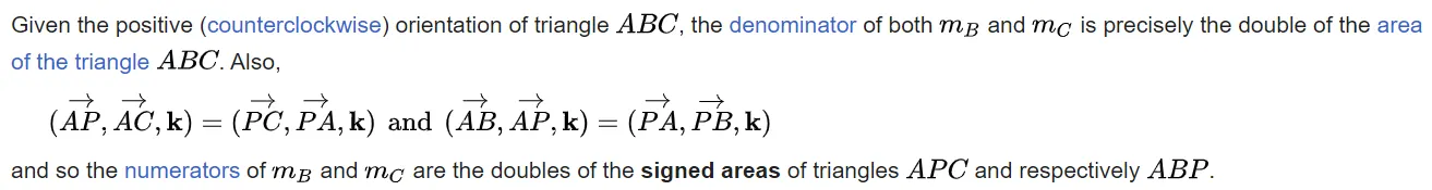 그럼 위 공식을 사용해서 공식을 만족시키면 는 삼각형 내부의 점이라는 것을 알 수 있다. 그런데 이 방식은 여전히 아래의 공식과 다르다.