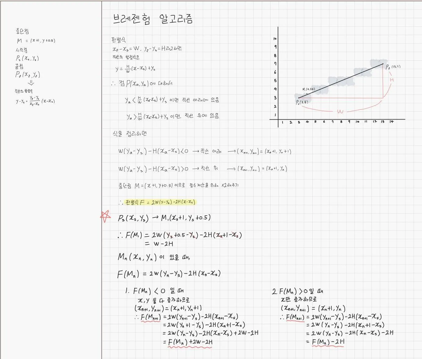 브레젠험 알고리즘 : 중단점을 기준으로 직선이 중단점 위에 있는지 아래에 있는지 확인하여 직선과 가장 가까운 정수값을 찾는 알고리즘.