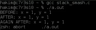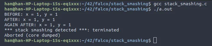 스택에 선언한 메모리의 범위를 벗어나는 접근을 하게 되면 stack smashing detected라는 에러가 발생합니다. (저는 ubuntu에서 테스트 했습니다.)