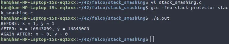 -fno-stack-protector 옵션으로 컴파일하면 다음과 같이 직접 값을 변경하지 않은 x와 y가 변하는 것을 볼 수 있습니다. (스택에 선언된 메모리들은 연속적으로 위치하기 때문인 것 같습니다.)