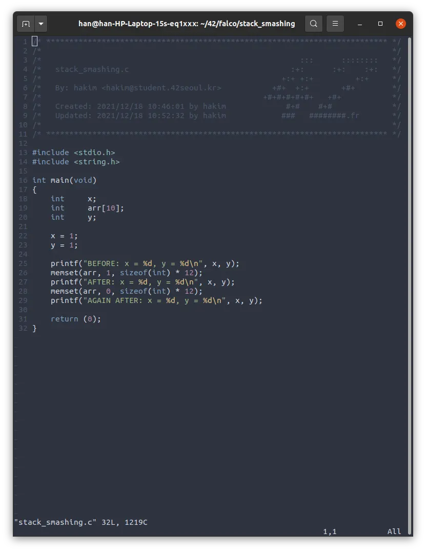 gcc는 기본적으로 stack smashing을 보호해주기 때문에 값이 변하는 것을 볼 수는 없지만,