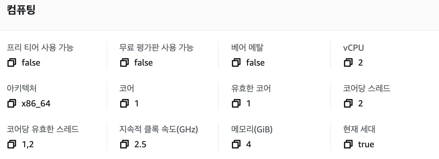 이에 따라, EC2 자체에서 Docker로 해당 DB 서버를 연결하고 사용하도록 구성하고자 했다. 또, Docker를 내부에서 실행하고 WAS도 실행하는 만큼, 너무 작지는 않은 인스턴스를 사용해야겠다고 판단했고, t3.medium을 선택했다.