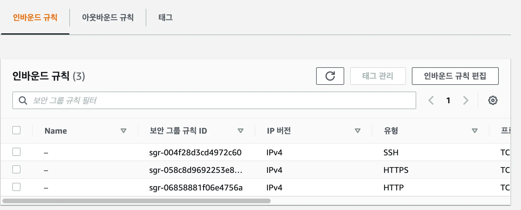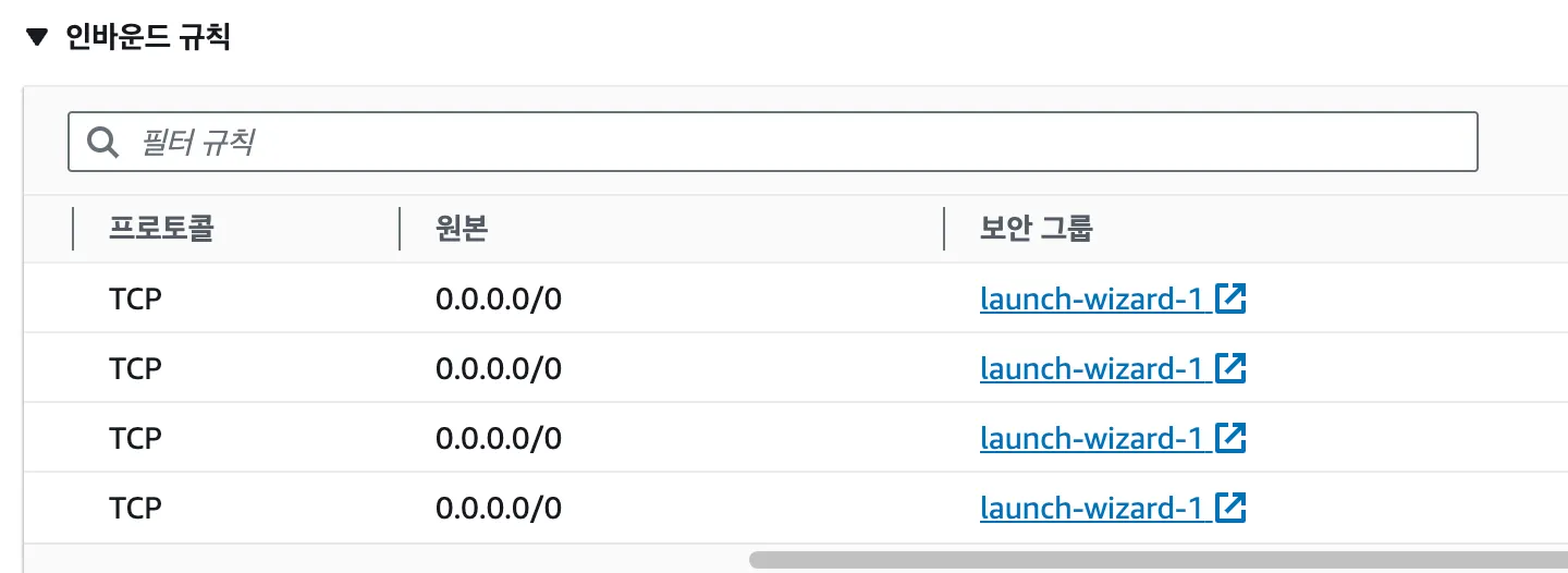AWS 콘솔에서 EC2 인스턴스 - 보안 - 세부정보를 보면 기본으로 지정된 보안 그룹이 있다. 별도의 그룹에 규칙들을 설정해서 적용해도 되지만, 현재는 기본 그룹에 다른 규칙을 추가하는 방식으로 설정해보자.