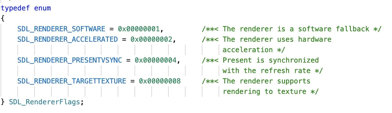 SDL_Renderer *renderer = SDL_CreateRenderer(window, -1, SDL_RENDERER_ACCELERATED | SDL_RENDERER_PRESENTVSYNC);