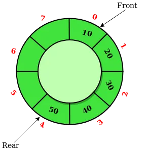 circular queue의 장점은 배열로 구현할 수 있다는 것이다. 위 처럼 front 와 rear사이에 유효한 데이터를 저장하면서 queue의 형태를 띈다.