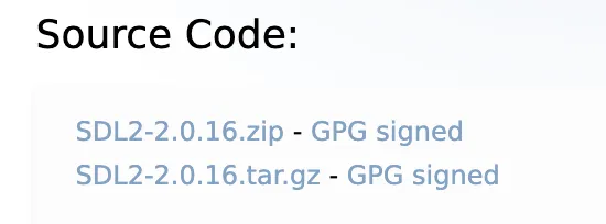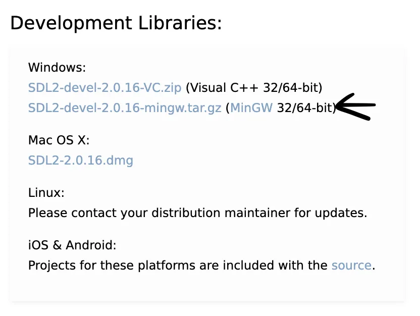 SDL 공식 홈페이지에 가면, 아래 사진처럼 소스 코드를 다운받을 수 있다.