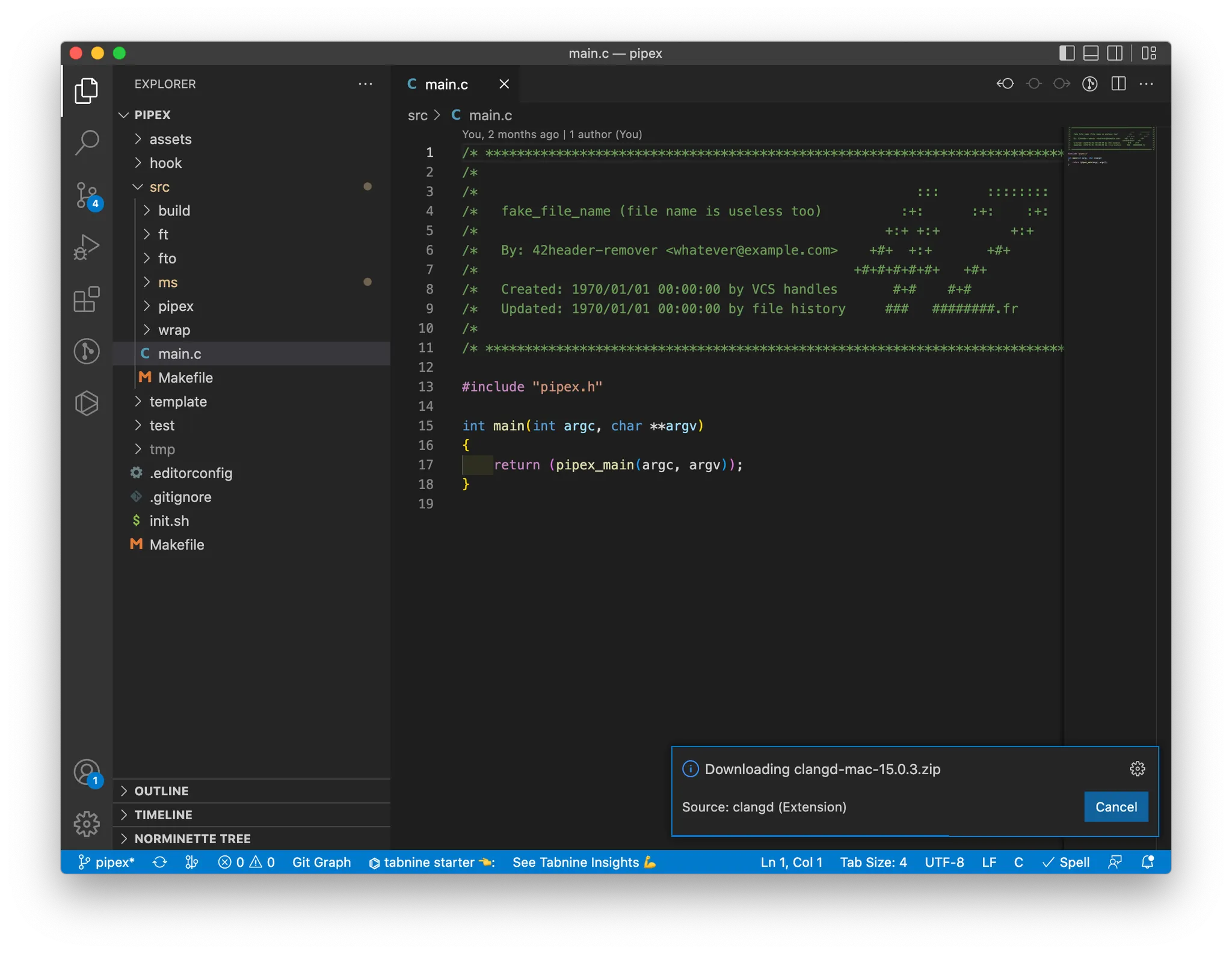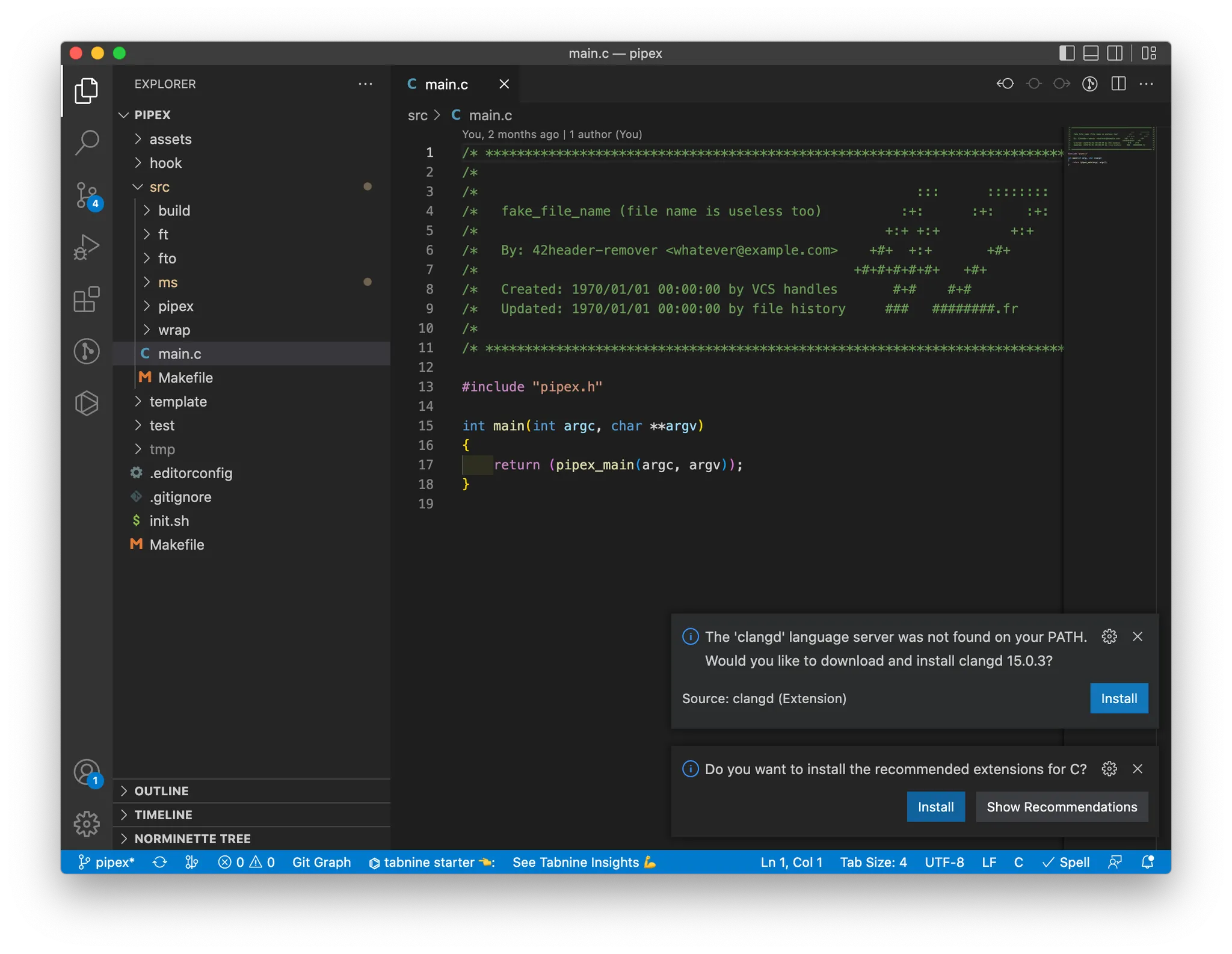 그 다음에 아무 C/C++ 파일을 열면 clangd language server를 설치하라는 알림이 나오는데,