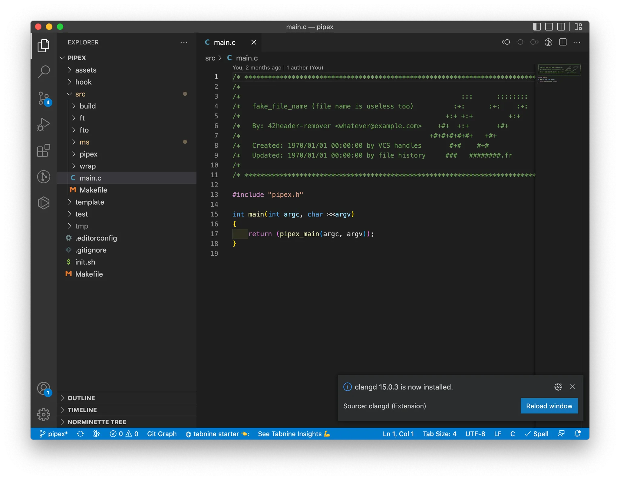 clangd 설치가 완료되면 Reload window 버튼을 누르면 vscode에 대한 설정은 끝납니다.