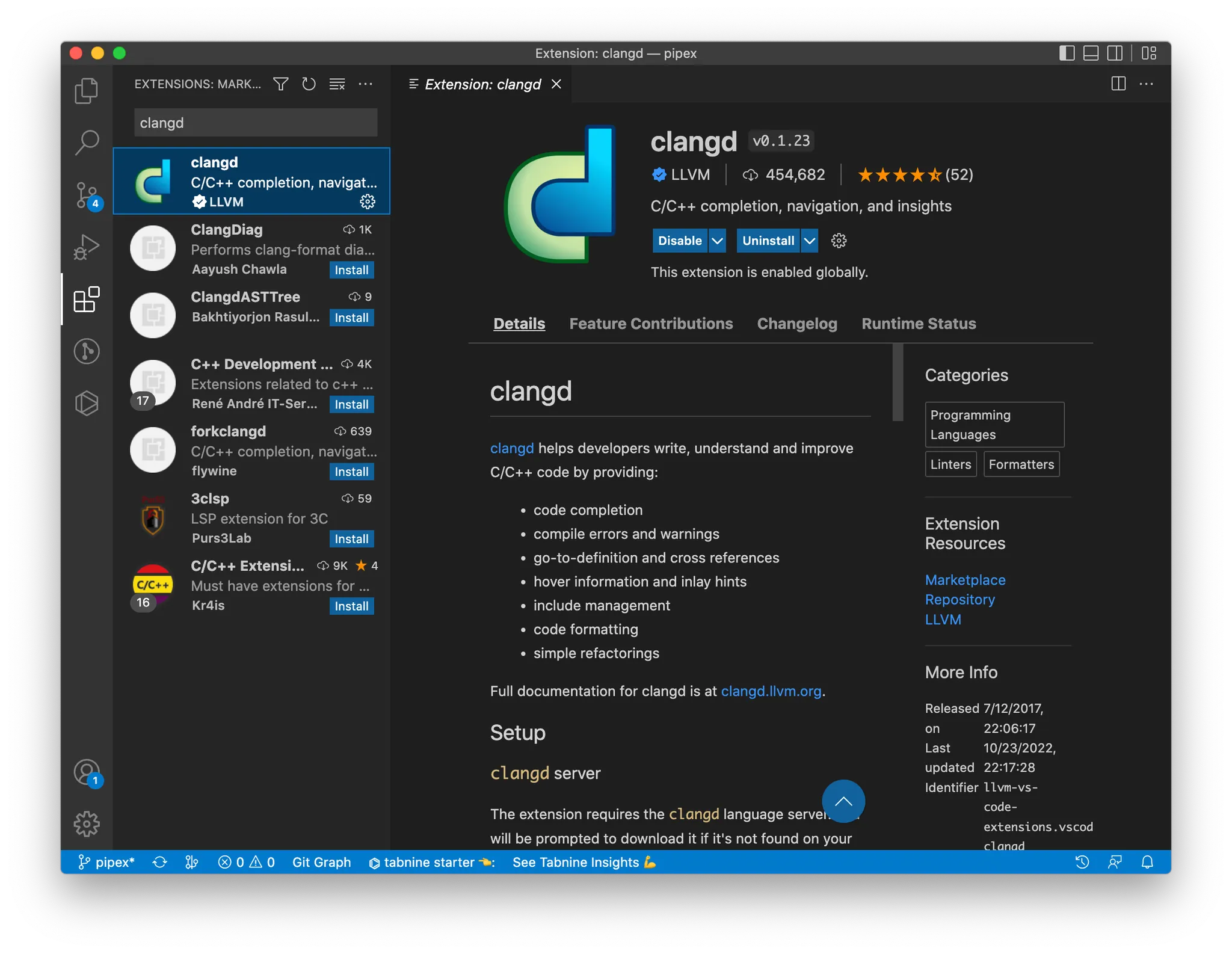 vscode의 extension marketplace (cmd + shift + x)에서 clangd를 설치해주세요.