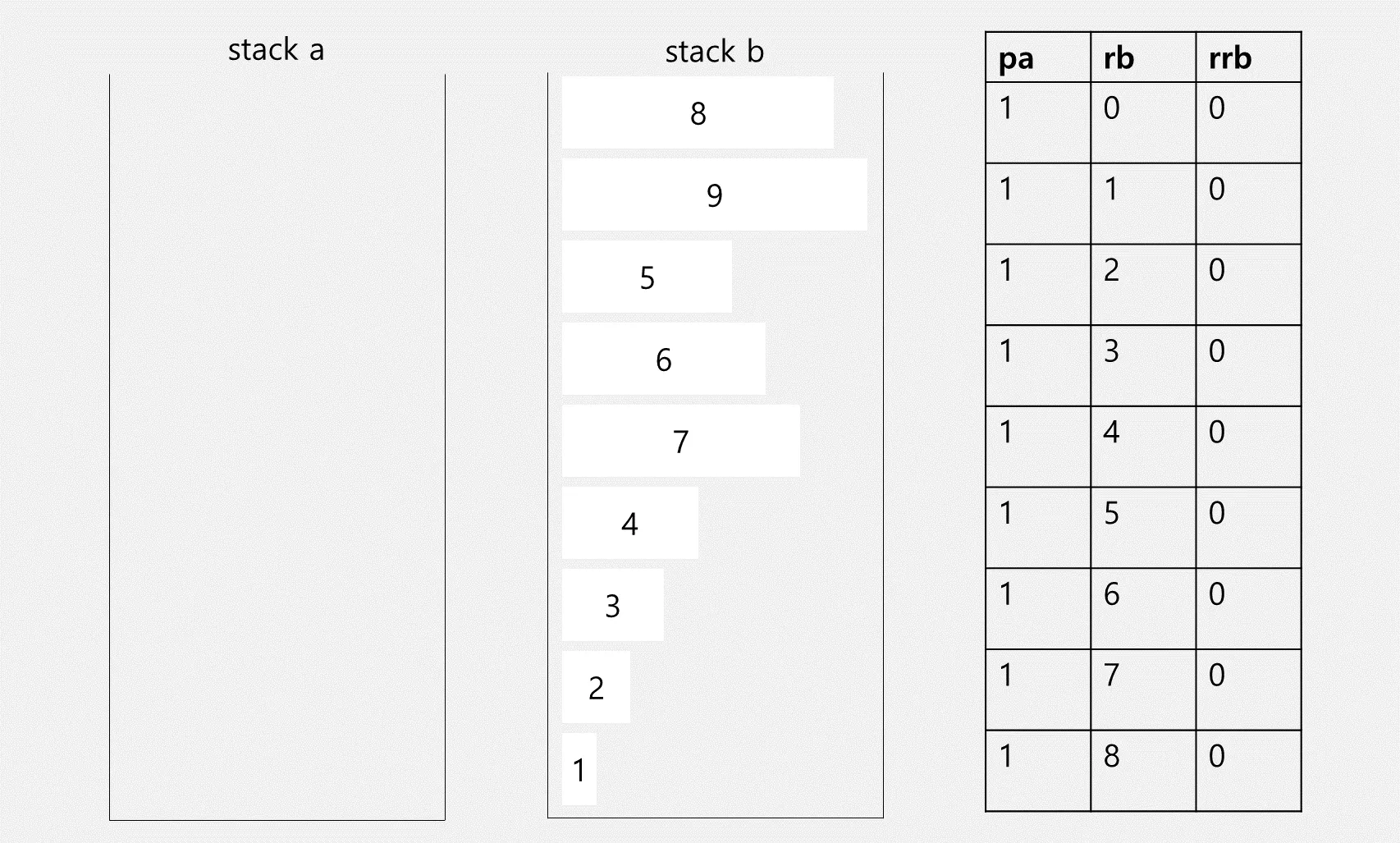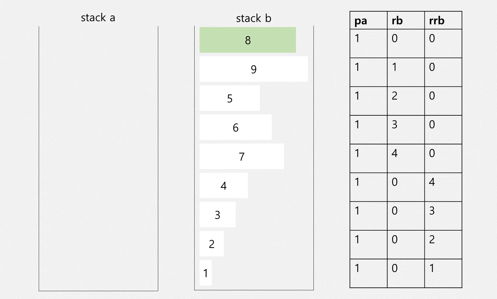 가장 앞쪽에 있는 요소가 9이니, 이제 9를 구한 명령어만큼(pa 1번, ra 1번) 실행하면 됩니다. 이제 규칙을 알았으니 반복하면 됩니다. (실은 pa는 언제나 한 번만 하므로 명령어 개수 계산할 때 pa를 빼놓고 구합니다만… 그림을 잘못 그렸습니다.)