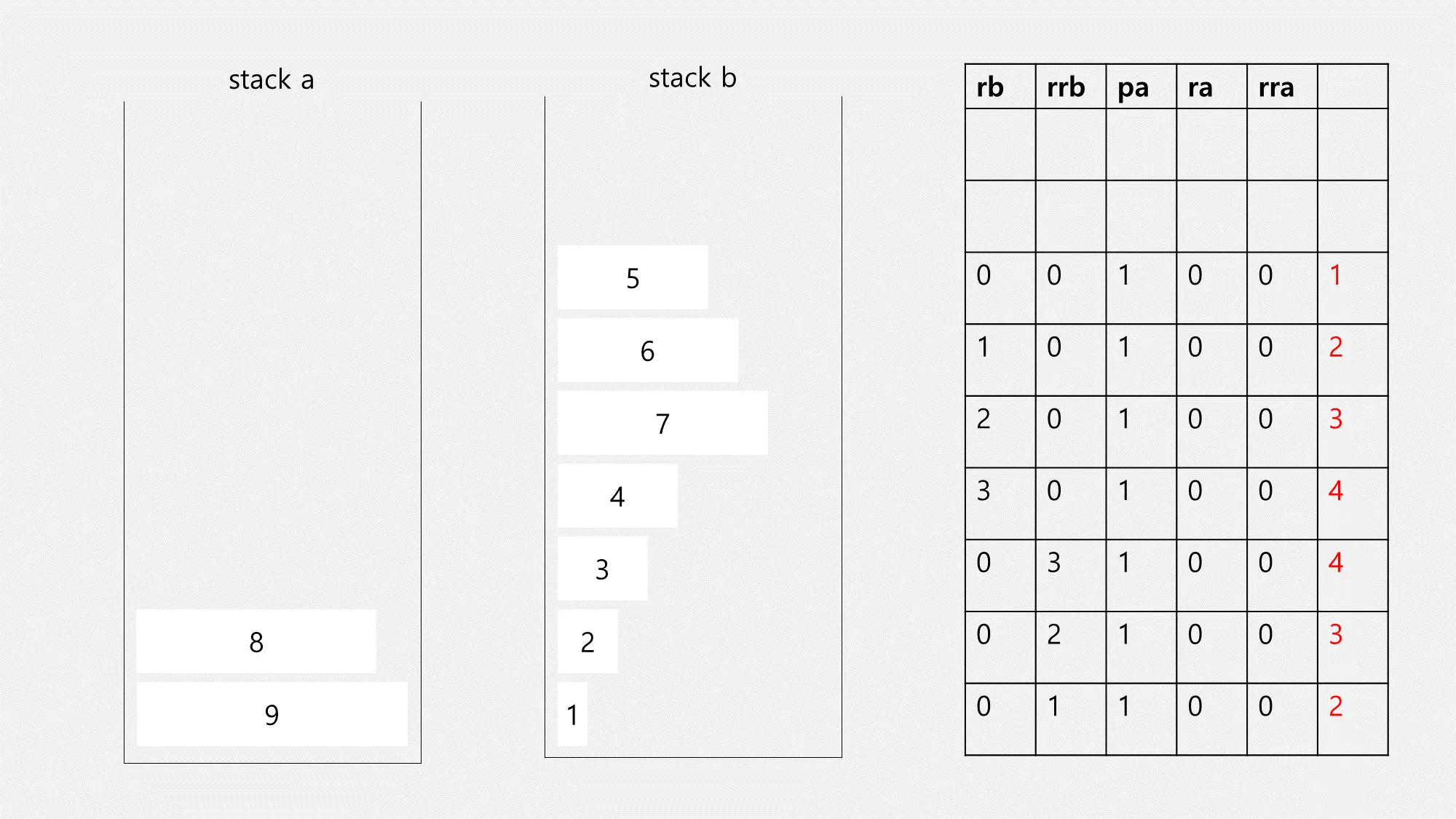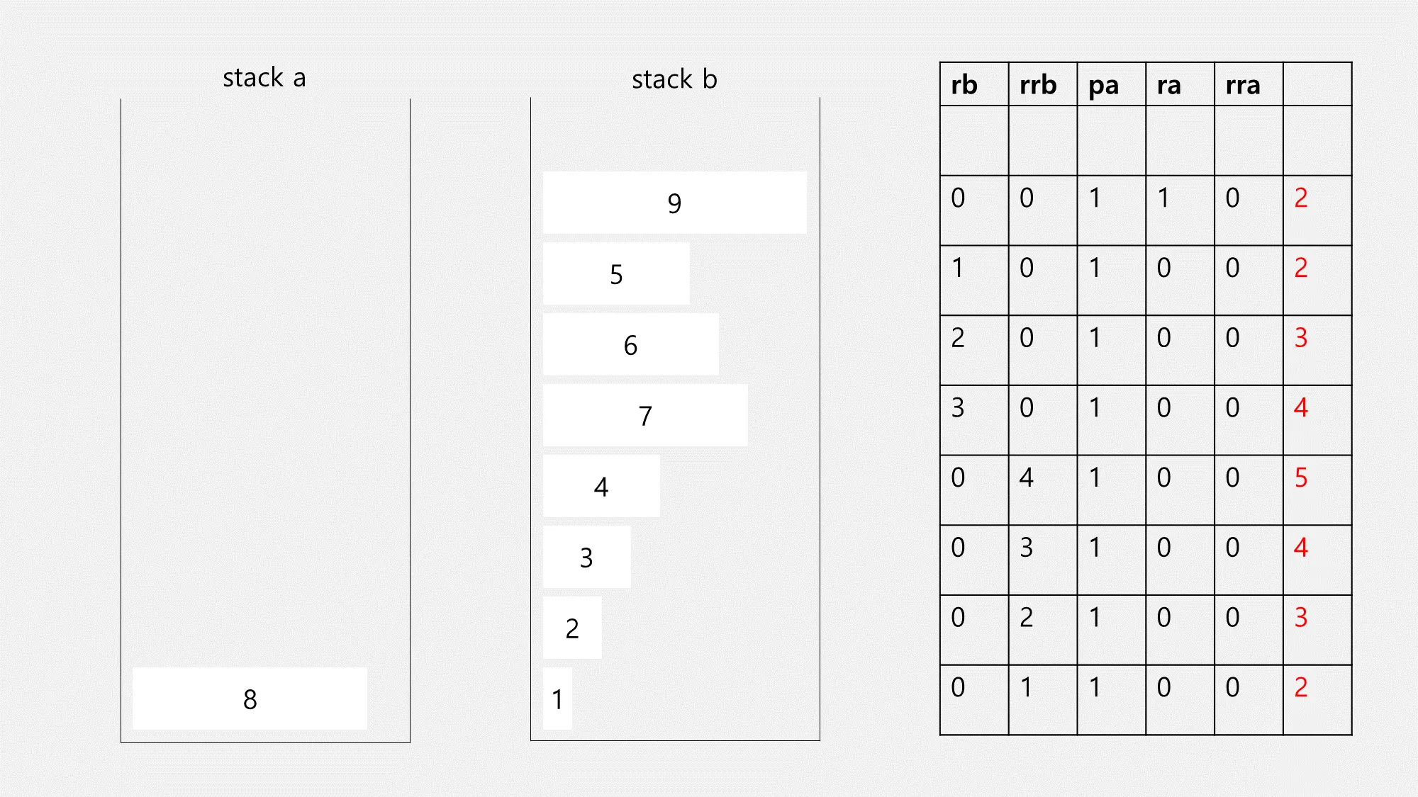 partitioning을 완료했다면 이제 정렬을 할 차례입니다. stack b 옆에 각각의 요소가 stack a로 넘어가려면 몇 개의 명령어를 사용해야 하는지 정리하였습니다. 이때 우리가 알 수 있는 점은 각 요소의 인덱스 번호와 rb 명령어의 개수가 동일하다는 점입니다.