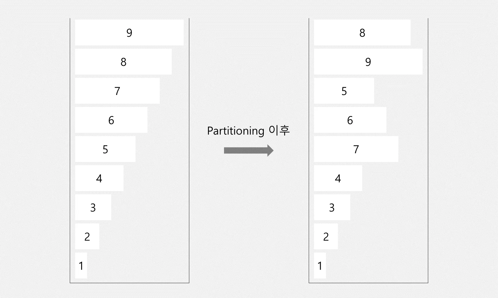우선 피봇을 기준으로 나눈 뒤, a에 남아있는 수들을 b로 옮기면 다음과 같은 모양이 됩니다.
