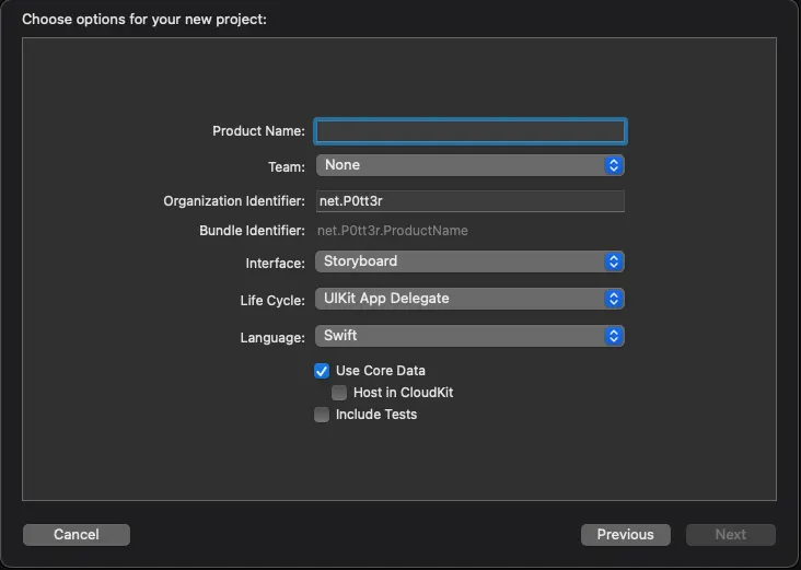 하단 버튼 중 [Use Core Data]를 체크하여 프로젝트를 생성합니다.