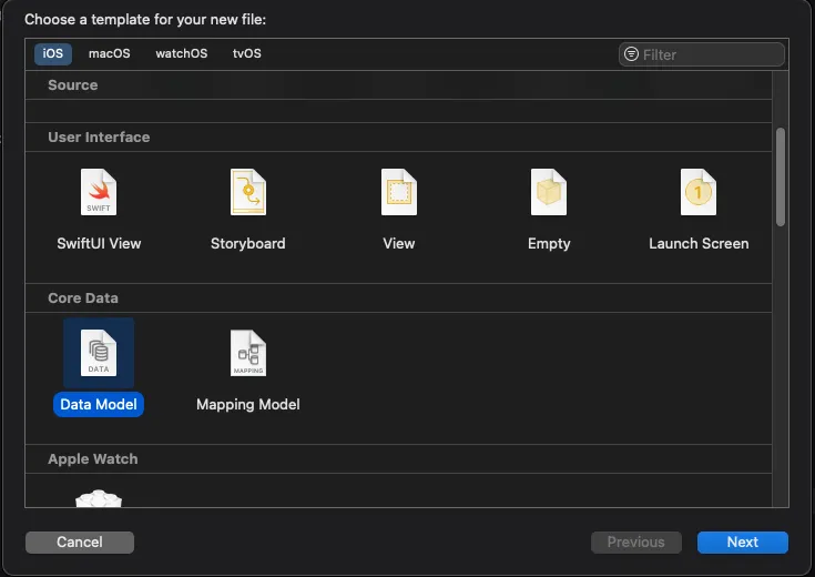 Core Data를 사용하기 위해서는 앱의 객체 구조를 담을 데이터 모델 파일을 생성해야 합니다.