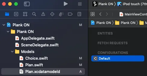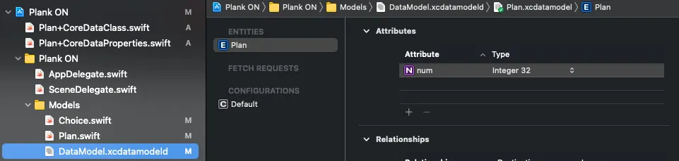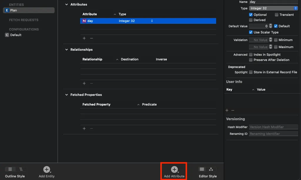 Core Data model을 추가한 후, .xcdatamodeld 파일에서 아래와 같이 Entity를 추가한다.