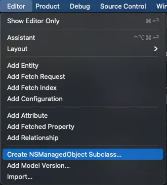 상단 메뉴 바에서 Editor > Create NSManagedObject Subclass 선택