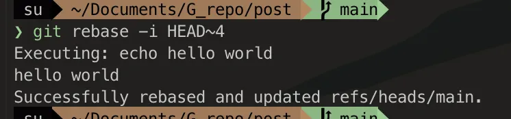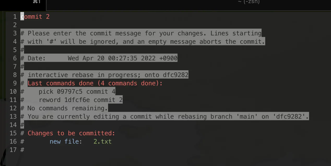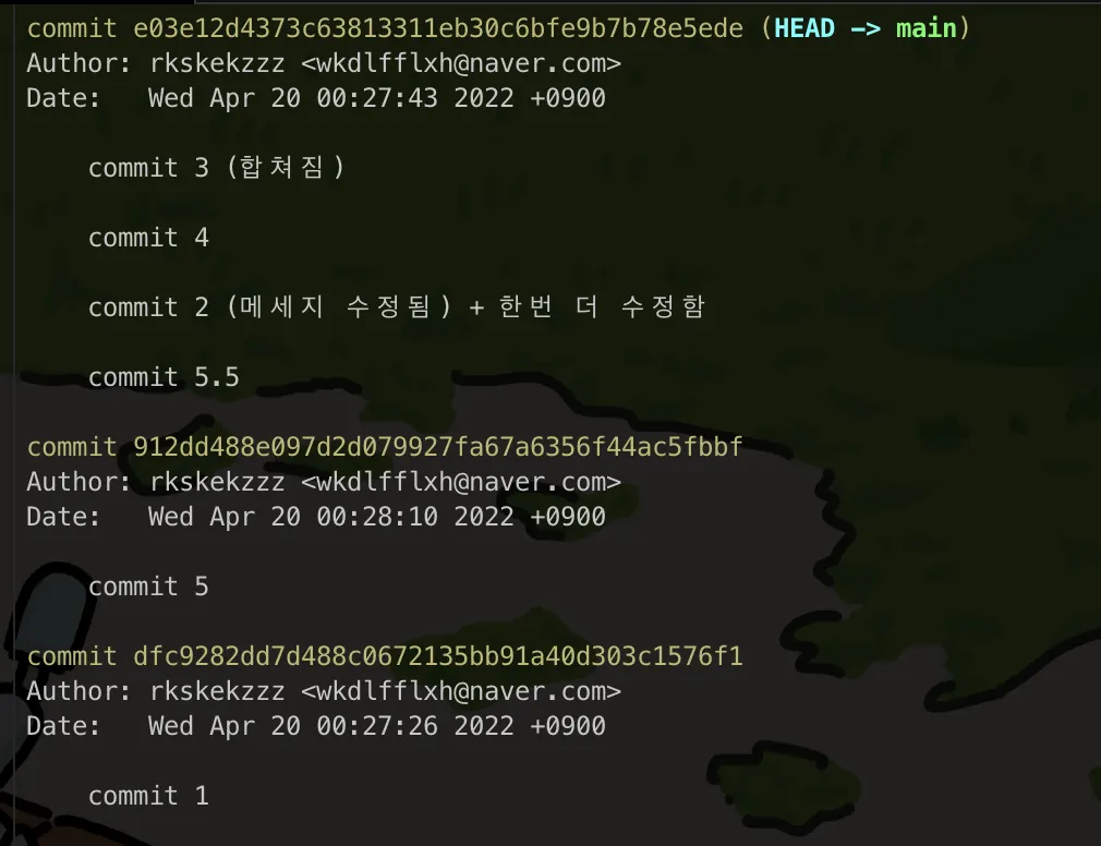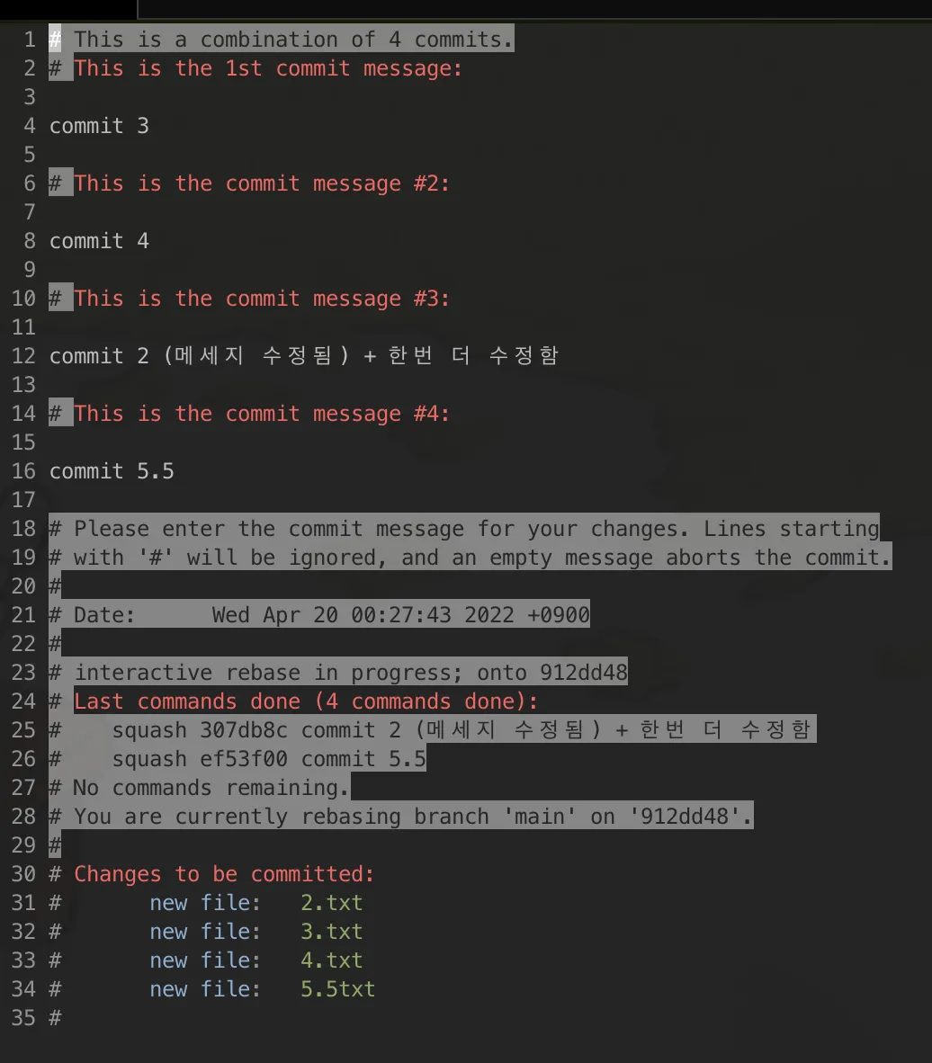 interactive editor를 저장, 종료하고 나면 아래 사진과 같은 화면이 나오는데, 설명을 살펴보면 변경하고 싶은 커밋을 본 editor에서 수정하라고 적혀있다. 이 때, 주석은 무시된다. 여기서 3번 커밋에 추가로 (합쳐짐)을 적어보겠다.