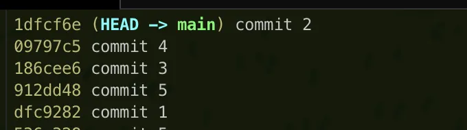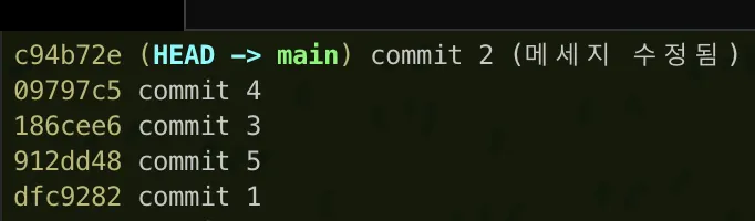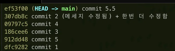 이제 git log --oneline을 통해 커밋기록을 살펴보면 정상적으로 순서가 바뀐것을 볼 수 있다.