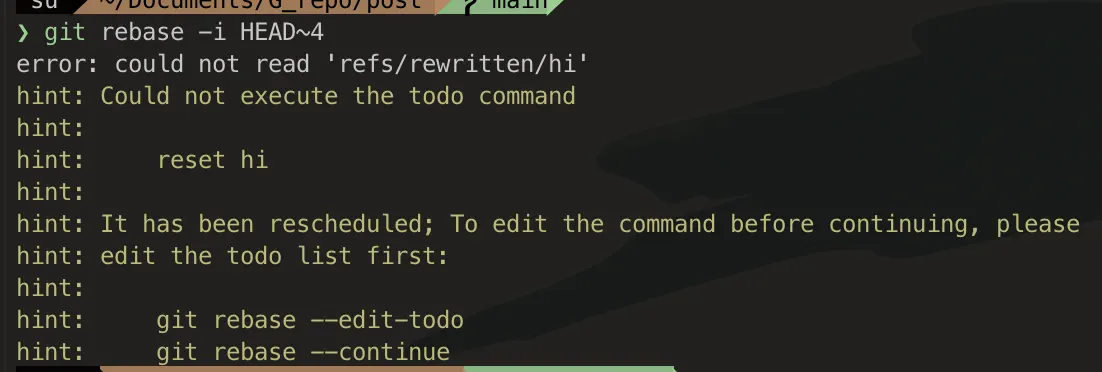 reset은 HEAD 포인터 및 worktree를 특정한 지점으로 바꿔준다. 하지만 만약 reset을 실행하는데 실패하게 된다면 아래와 같이 즉시 수정하는 방법에 대한 가이드를 출력된다. rebase가 동작하는 런타임에 지정한 label이 없는 경우에 실패할 수 있다.