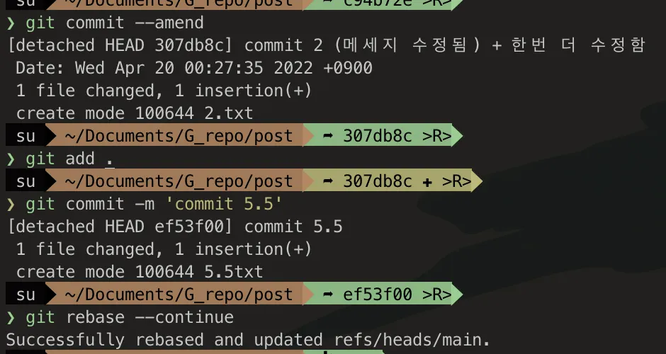 우선 git commit --amend를 활용해서 메세지를 한번 더 수정하고, 새로운 파일을 만들어 새 커밋을 추가해 보았다. 그리고 git rebase --continue 명령을 사용하였다.
