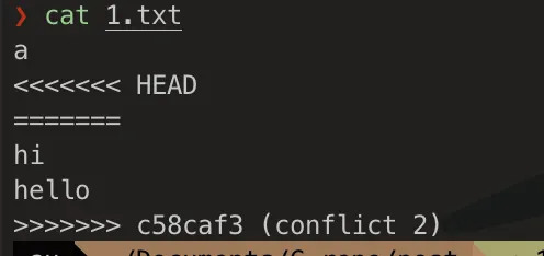 실제 충돌난 부분은 원래 conflict 난 파일을 처리하는 것과 동일한 형태로 되어있다.