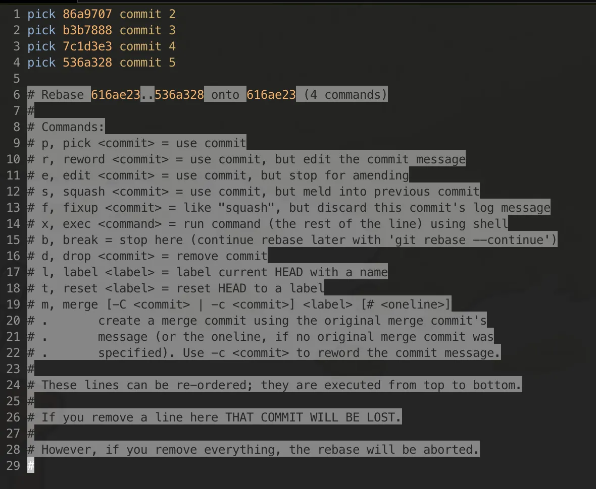 이상태에서 :wq 를 활용해 interactive editor를 종료시키면 주석이 되어있지 않은 라인을 한줄씩 실행시키게 된다. 즉, 위 사진을 그대로 수정없이 저장, 종료하게 된다면, 각각의 커밋에 대해 모두 pick 명령어를 실행하게 되는 것이다.