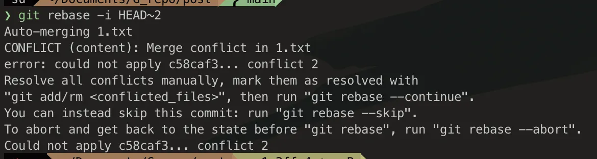 위의 경우처럼 중간에 rebase를 실패하거나 중단된 경우, 아래 명령어를 활용해서 실행한 rebase를 되돌릴 수 있다. 명령을 실행하면 rebase를 실행하기 전으로 되돌아간 것을 볼 수 있다.
