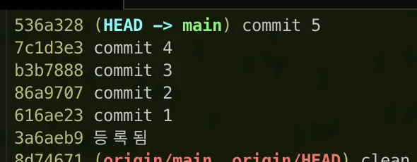 우선 git 레포지토리를 준비한다. 아래 사진처럼 미리 5개의 커밋을 기록해둔 상태이다.