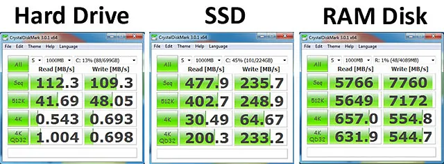 아래는 HDD, SSD, Memory(RAM)의 속도 차이를 보여준다.