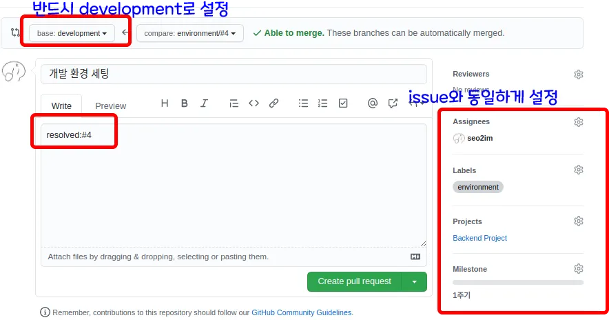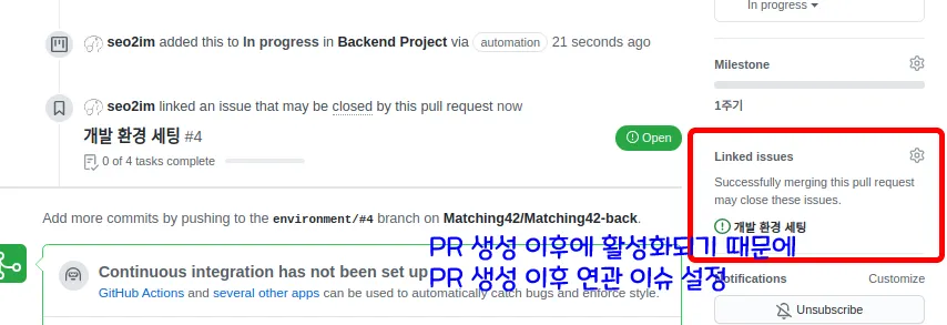 PR생성 후 linked issue를 등록한다(그림 참고)