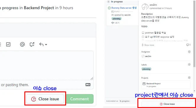 모든 Todo가 마무리되면 issue를 close 할 것(close에 따로 내용은 적지 않아도 됩니다)